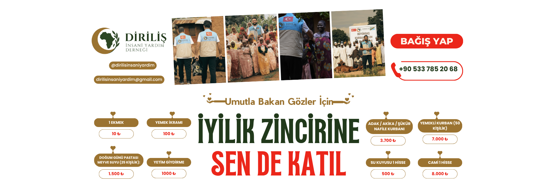 “Genel bağışlarınız, Diriliş İnsani Yardım Derneği’nin dünyanın farklı bölgelerinde yürüttüğü insani yardım faaliyetlerine destek olur. Yapacağınız her bağış; ihtiyaç sahiplerine ulaştırılan bir yardım, kurulan bir sofra ve umut olan bir iyilik olarak karşılık bulur. Birlikte daha fazla mazluma ve yetime ulaşmak için destek olabilirsiniz.”