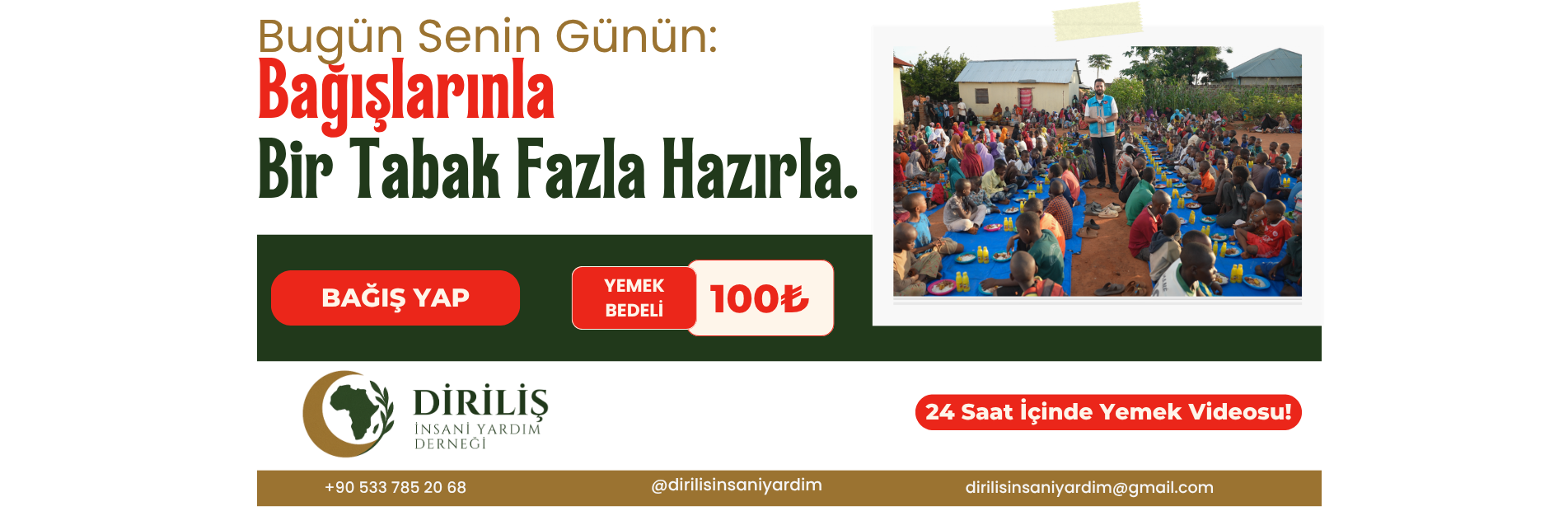 “Her Cuma Afrika’da kurulan yemek sofralarımıza siz de bir tabak ekleyin. Bağışınızla ikram edilen yemekler, 24 saat içinde video olarak sizlerle paylaşılmaktadır.”