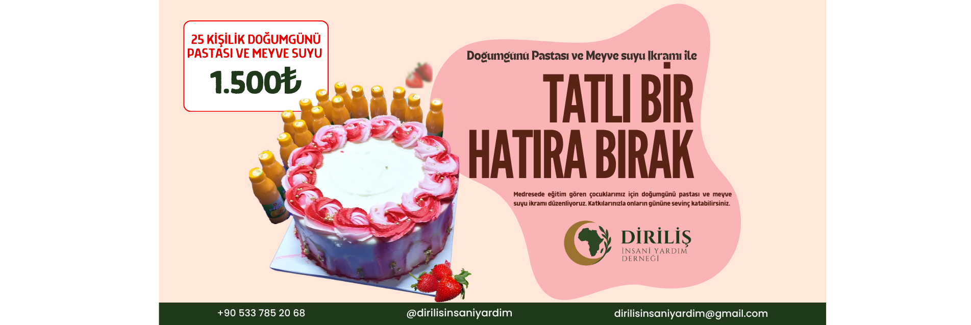 Sizlerin katkısı, bu özel günü daha da unutulmaz kılacaktır. Yapacağınız bağış ile sadece pasta ve meyve suyu temin etmekle kalmayacak, aynı zamanda çocukların kalplerine sevgi ve neşe taşıyan bir mutluluk zincirine de katkıda bulunmuş olacaksınız.
